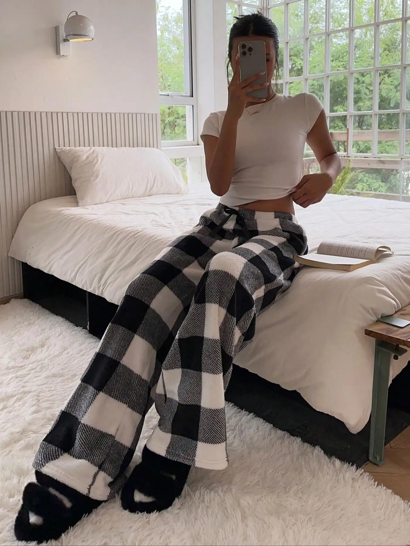 Classic black-and-white checkered lounge pants with a laid-back, comfortable feel. Perfect for off-duty moments, relaxing at home, or casual nights in. Crafted from a soft, fleece-style fabric with an easy, relaxed fit.